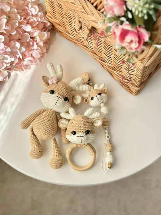 ست بافتنی گوزن شامل یک عروسک ،جفجغه ،بند پستونک به صورت ست کامل قابل سفارش میباشد